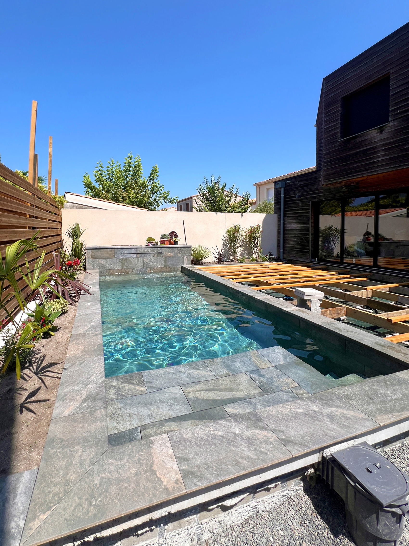 - Plage immergée de 2.4 x 1 m avec escalier intégré + Banquette de 3 x 0.50 m + Cascade